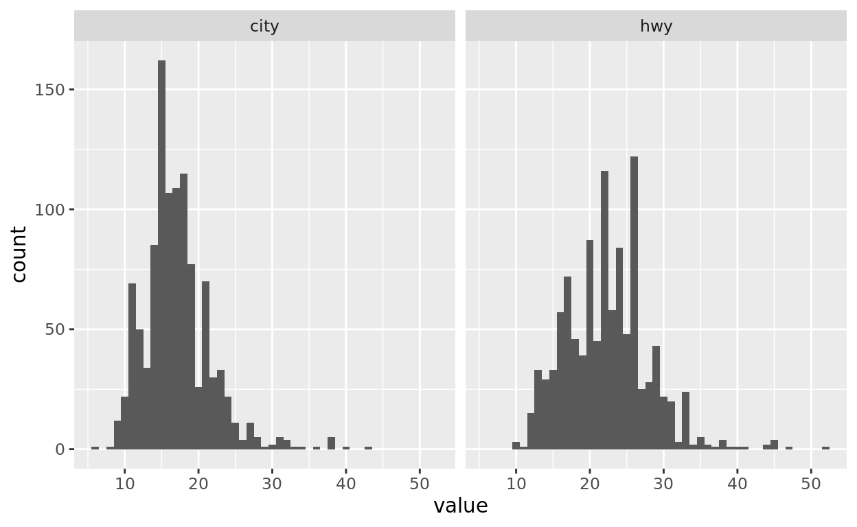 Let’s compare the histogram of city to hwy. To do this, we will need to pivot our table, so we have one variable that indicates whether the mileage is “city” or “highway”.