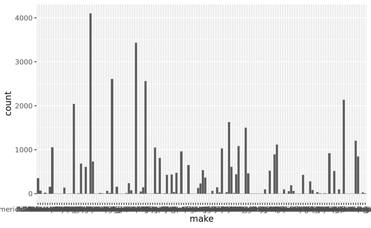 One hundred thirty-eight different makes represented in the data set; this makes the \(x\)-axis unreadable.