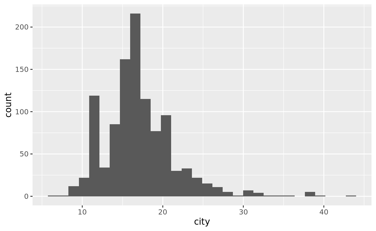 The line plot shows the trends over time in the average EPA City fuel economy ratings. Still, if we want to look more closely at a specific year to see the distribution or density of EPA City fuel economy ratings, we need to use a histogram.