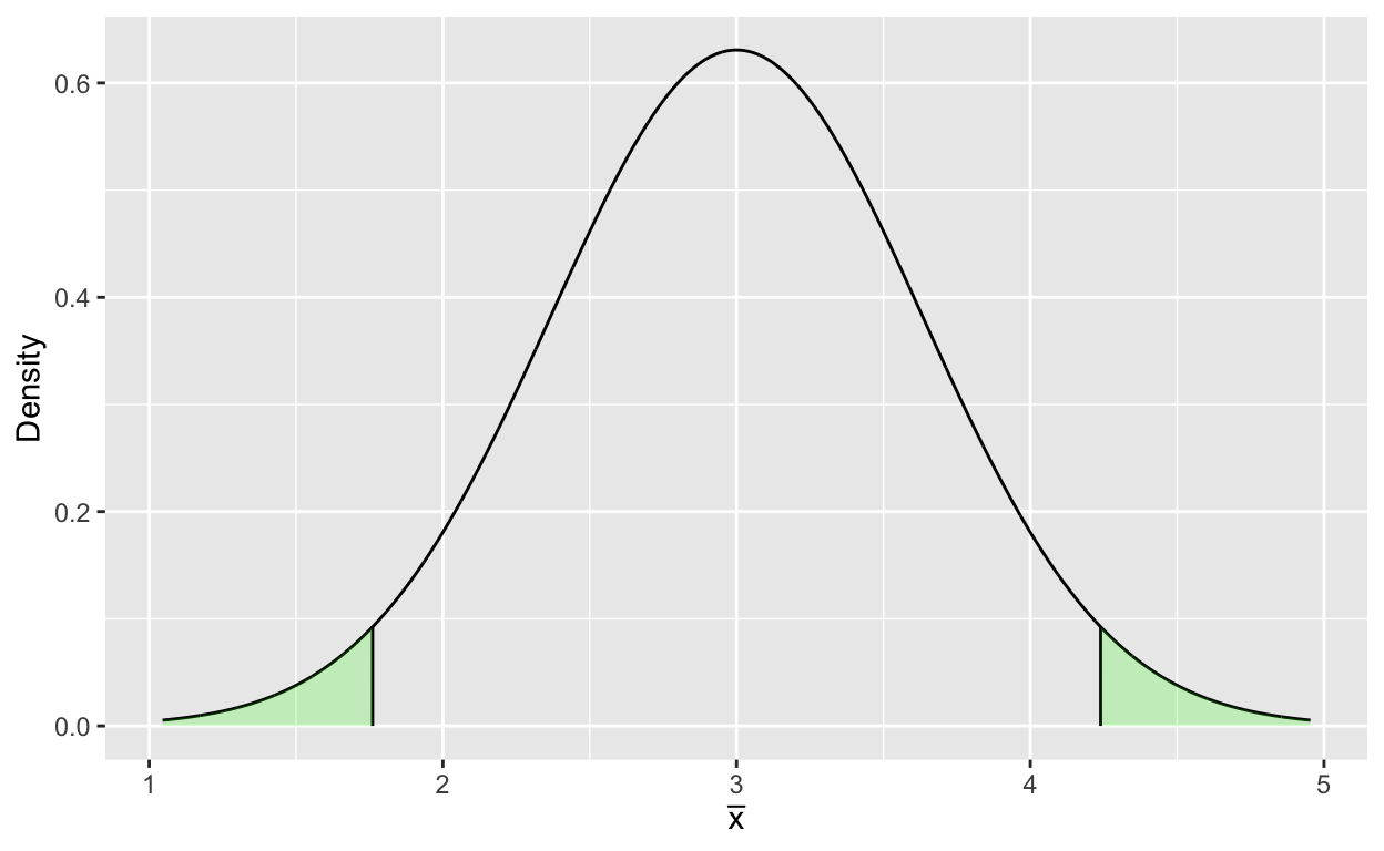 In the plot below, the area bounded by the shaded regions is the \(95\%\) confidence interval based on \(\bar{x}\) for \(\bar{x}=3\), \(\sigma = 2\), and \(n=10\). The area of the two shaded tails is \(\alpha/2\).