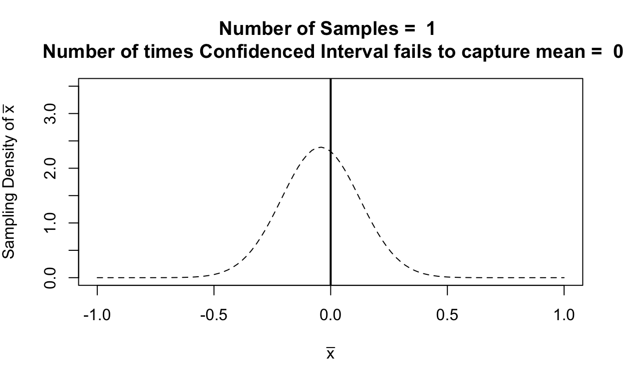 Now watch the animation showing the sampling density of \(\bar{x}\) calculated from a sample of size \(n=30\) from \(X\sim N(0,1)\) the plot flashes red when the true value of the mean \(\mu=0\) falls outside the \(95\%\) confidence interval, which illustrates how the confidence is associated with the interval, not the parameter \(\mu\). Note that \(\mu\) doesn’t move but the confidence interval does.